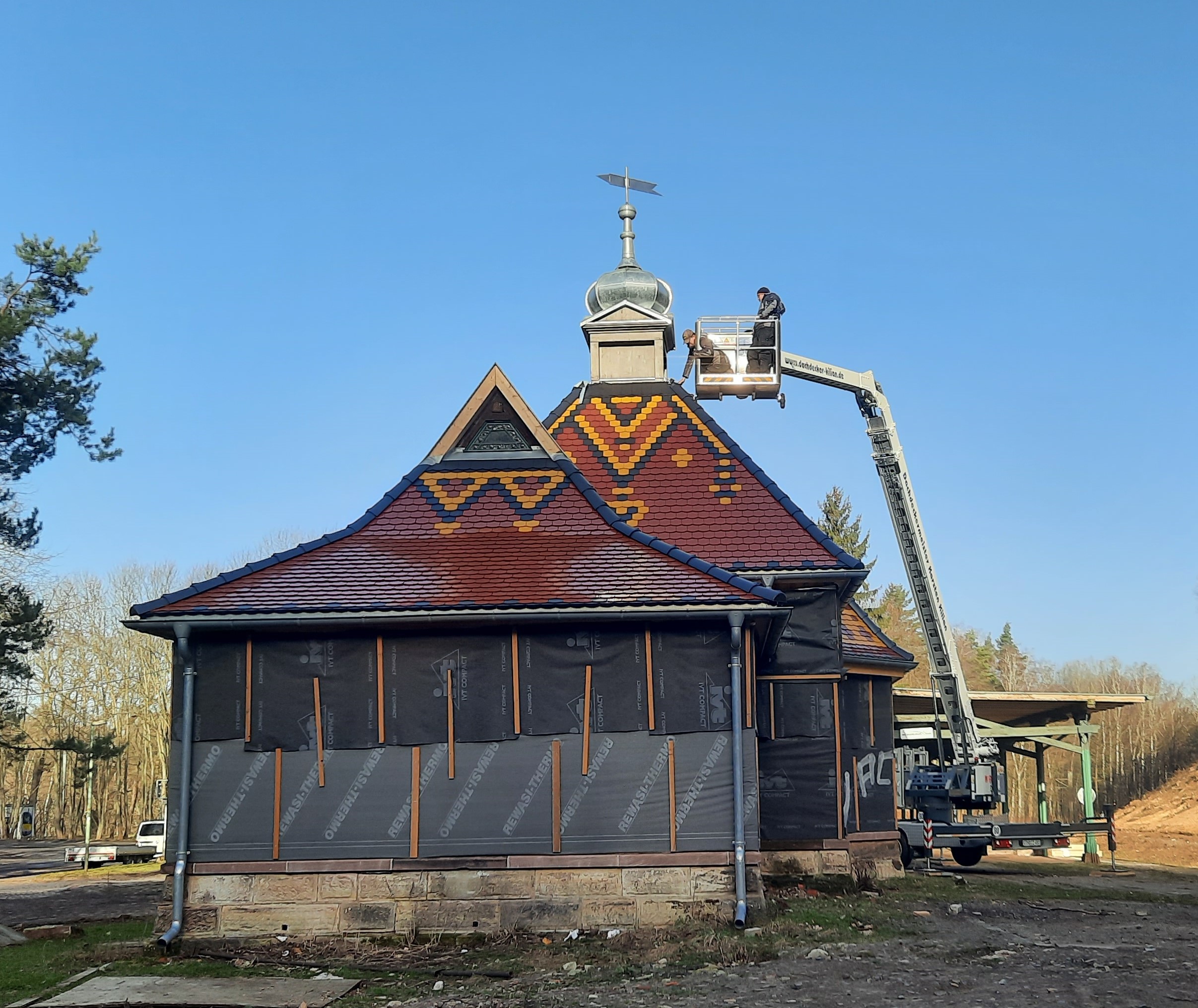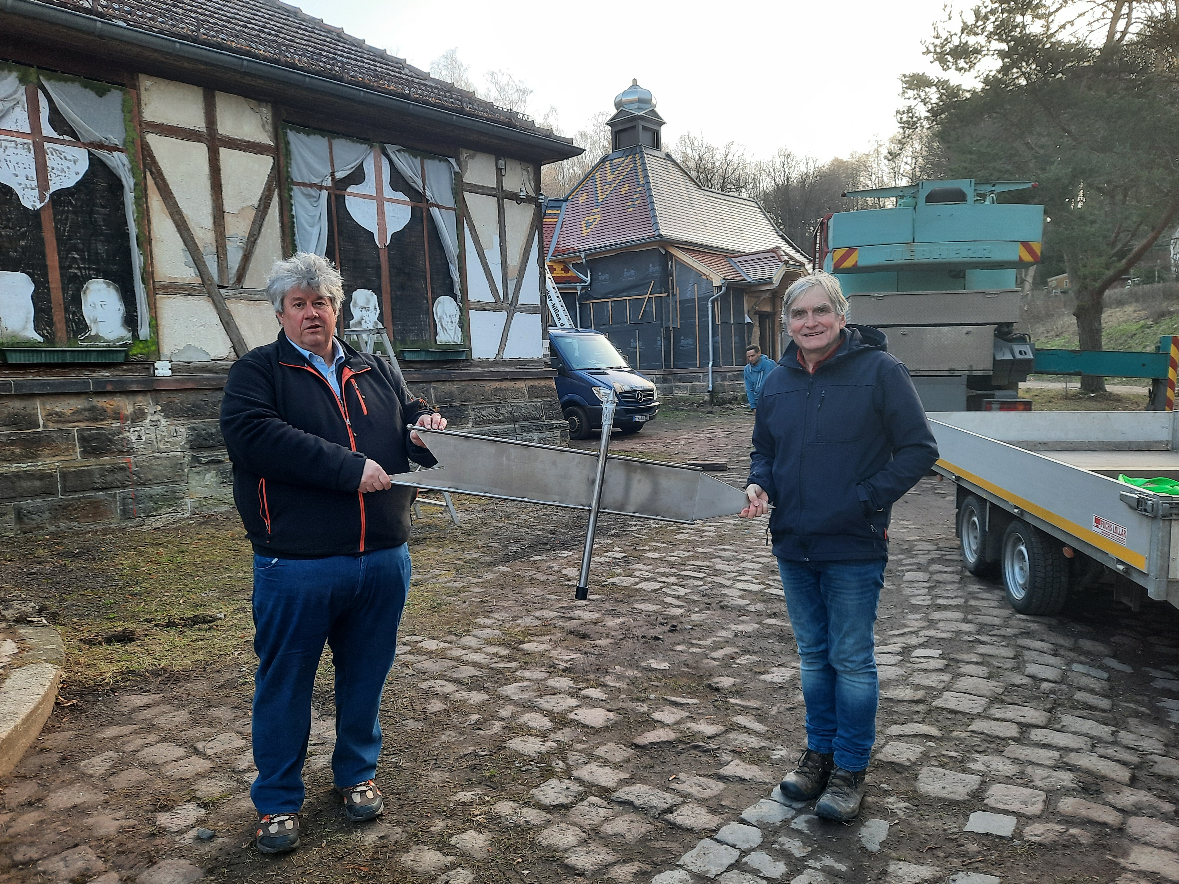 Der Bürgermeister Herr Klöppel und Herr Henniges von der Bauverwaltung der Stadt Friedrichroda waren beim Aufsetzen der Haube anwesend.
